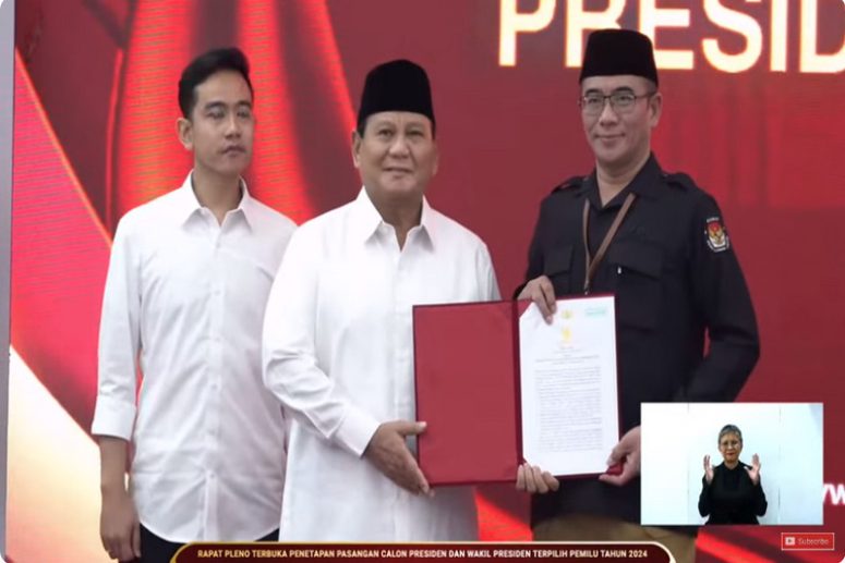 Penetapan tersebut tertuang dalam berita acara nomor 252/PL.01.9-BA/05/2024 tentang Penetapan Pasangan Calon Presiden dan Wakil Presiden Terpilih Dalam Pemilihan Umum Tahun 2024.