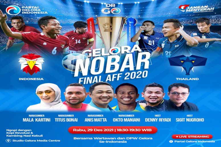 Ketua Bidang Gaya Hidup, Hobi dan Olahraga (Gahora) DPN Partai Gelora Kumalasari (Mala) Kartini mengatakan, acara nobar final Piala AFF Suzuki 2020 ini sengaja digelar untuk memberikan dukungan kepada Timnas Indonesia yang akan melawan Thailand.