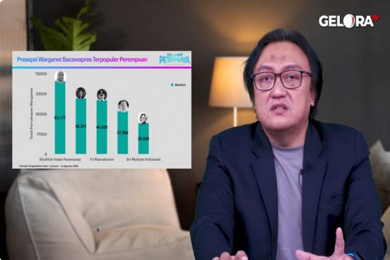 Hal itu disampaikan Endy Kurniawan saat memaparkan hasil riset digital Gelora Petamaya Edisi ke-8 tentang ‘Pandangan Warganet terhadap Cawapres Perempuan’ yang ditayangkan di kanal YouTube pada Minggu (27/8/2023) malam.