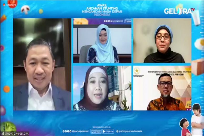 Diskusi ini menghadirkan narasumber Lead Program Manager, Tim Percepatan Pencegahan Anak Kerdil (Stunting)-Setwapres, Iing Mursalin, Ahli Gizi Poltekkes Kemenkes Sulawesi Tenggara Intan Ria Nirmala, dan Wakabid Perempuan DPN Partai Gelora Indonesia dr Rina Adeline, SpMK, MKes, ABAARM.