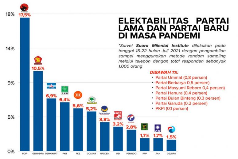 Partaigelora.id – Lembaga survei Suara Milenial Institute merilis survei terbaru tentang elektabilitas partai politik di masa pandemi pada Jumat (29/7/2021) lalu.