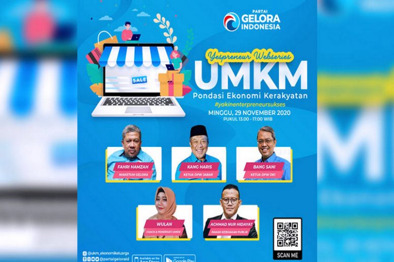 Dalam acara peresmian ini juga digelar webinar tentang ‘UMKM Pondasi Ekonomi Kerakyatan’ dengan pembicara pakar kebijakakan publik Achmad Nur Hidayat, Ketua DPW Partai Gelora DKI Jakarta Triwicaksana, Ketua DPW Partai Gelora Jawa Barat Haris Yuliana dan Ketua Bidang Pengembangan UMKM dan Ekonomi Keluarga DPN Partai Gelora Wulan.