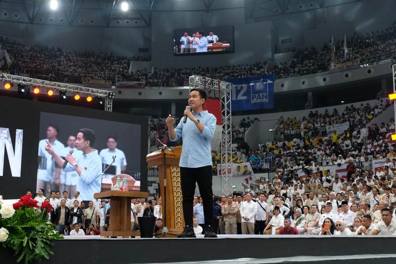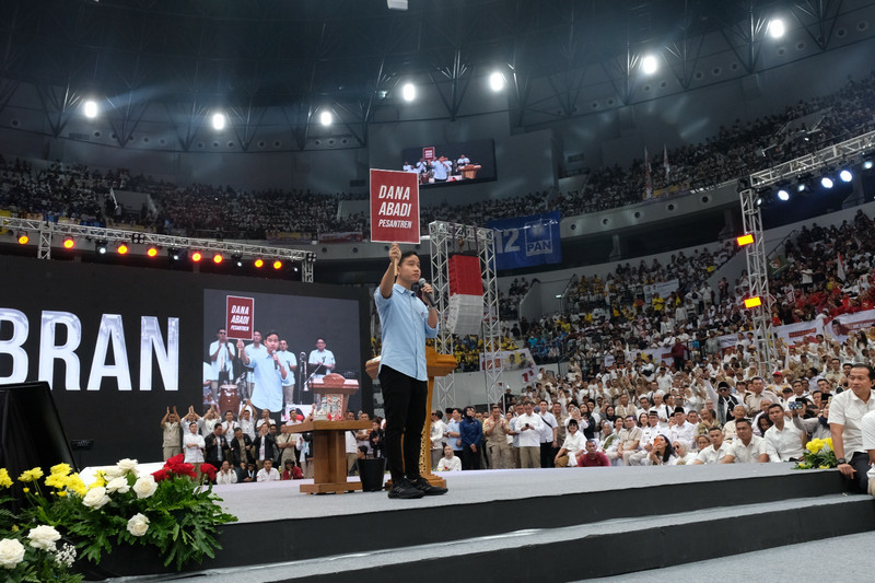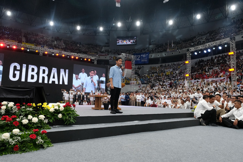 Kedatangan Prabowo-Gibran langsung disambut teriakan ribuan pendukung yang memenuhi Indonesia Arena. Lokasi ini menjadi tempat perdana keduanya dikenalkan kepada masyarakat sebagai pasangan capres cawapres. “Prabowo, Gibran,” teriak massa yang hadir.