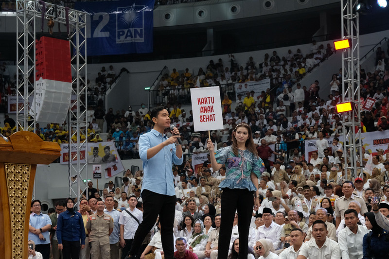 Terakhir, Gibran juga melontarkan program untuk anak. Kali ini, ia meminta istrinya yakni Selvi Ananda untuk menenteng tulisan program tersebut untuk dipamerkan ke hadirin. “Kartu Anak Sehat untuk Pencegahan Stunting,” tandasnya.