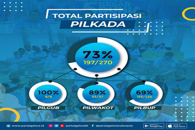 Partai Gelora Indonesia hingga kini diketahui telah menandatangani 197 Surat Keputusan (SK) dukungan paslon untuk pemilihan gubernur (Pilgub), pemilihan walikota (Pilwakot), pemilihan bupati (Pilbup) dari 270 Pilkada. Partai Gelora mengikuti 70 persen kontestasi Pilkada, yakni mengikuti 100 persen Pilgub, 86 persen Pilwakot dan 66 persen Pilbup.