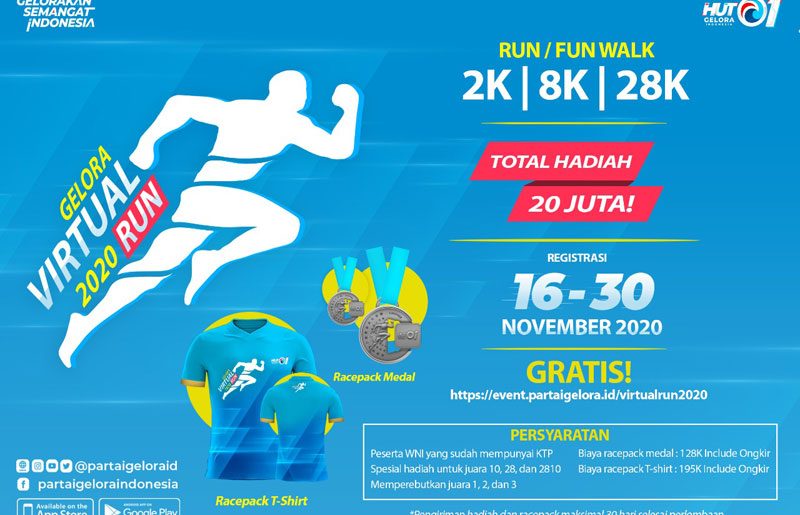 Partaigelora.id – Tanpa terasa pelaksanaan Gelora Virtual 2020 RUN & WALK yang digagas Gaya Hidup dan Olahraga (Gahora) Partai Gelombang Rakyat (Gelora) Indonesia telah menghasilkan para pemenang perlombaan tersebut. Event ini secara resmi dilaunching Ketua Umum Parta Gelora Indonesia Anis Matta pada Senin 16 November 2020 lalu.