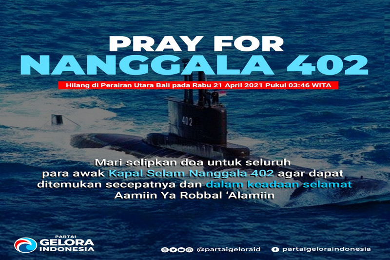 “Kita berharap Kapal Selam Nanggala 402 segera ditemukan dan para awak bisa diselamatkan. Semoga Allah SWT memberikan jalan terbaik. Aamiin Ya Robbal Alamin. Pray For Nenggala 402!” doa Ketua Umum Partai Gelora ini.